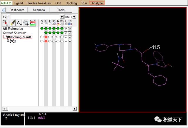 Analyze-Dockings-Open AutoDock Vina result-选择`结果PDBQT文件dockingResult.pdbqt-Single molecular with multiple conformations`。 -