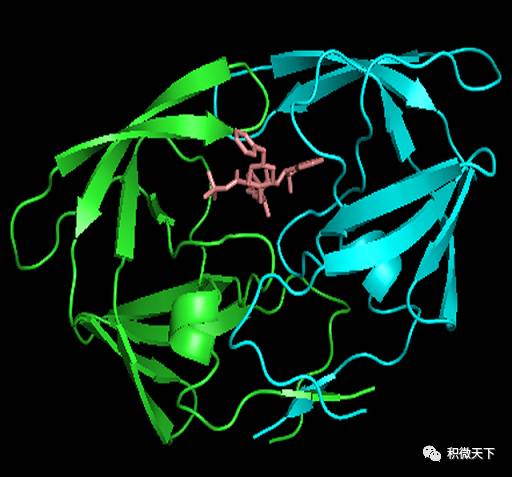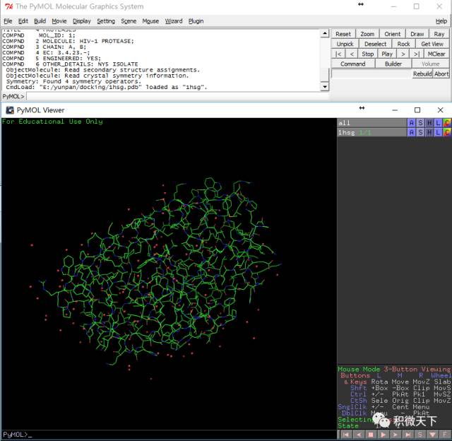例子文件是一个分辨率为2艾的X-射线衍射晶体结构(PDB ID: 1HSG),其为HIV-1蛋白酶与药物茚地那韦(indinavir)结合在一起的构象。软件PyMOL用来观察HIV-蛋白酶、结合位点和药物分子的结构。