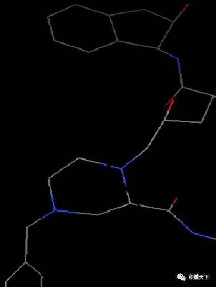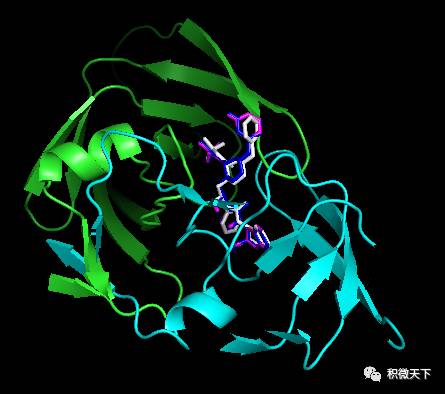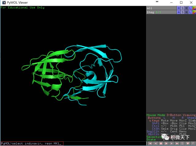 行indinavir的S列-Show stick,再点选C列选择一种不同的颜色。在屏幕无图处点击鼠标,取消小分子药物的选择状态。这时可以清晰的看到小分子的结构和空间位置(如下左图),随意拖动鼠标旋转或放大查看药物分子与蛋白的结合方式。PyMOL鼠标操作:按住左键移动旋转,按住右键移动放大,按住中键移动,观察结合位点所在的位置;滚动滚轮调节景深,化学结构会以 溶解形式出现。 -