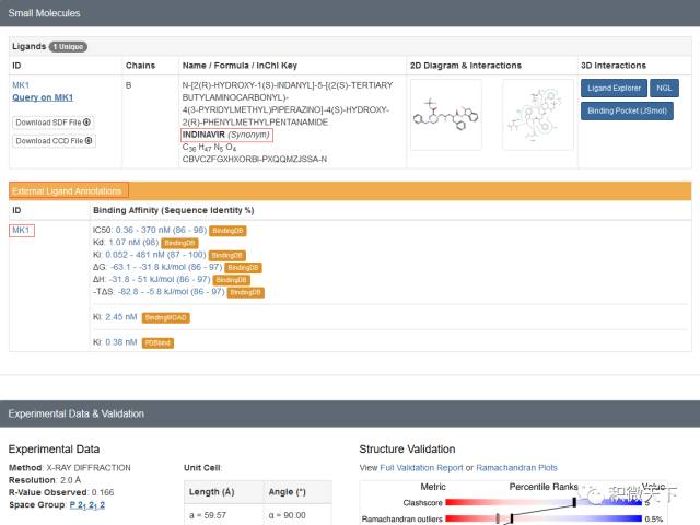 indinavir的配体残基名字为MK1,以HETATM开头的行表示非核心多聚体的成分 (heteroatoms)(具体见PDB文件格式解释)。 -