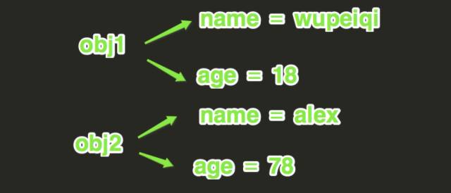上图展示了对象 obj1 和 obj2 在内存中保存的方式,根据保存格式可以如此调用被封装的内容:对象.属性名
