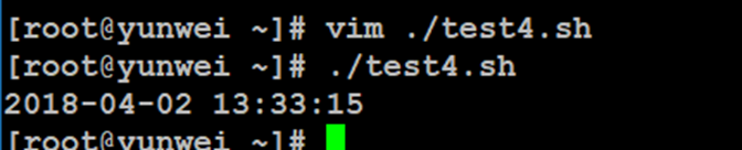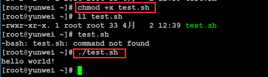 (注意,这里在运行时一定要写成 ./test.sh,而不是 test.sh,运行其它二进制的程序也一样,直接写 test.sh,Linux 系统会去 PATH(环境变量) 里寻找有没有叫 test.sh 的,而只有 /bin, /sbin, /usr/bin,/usr/sbin 等在 PATH 里,你的当前目录通常不在 PATH 里,所以写成 test.sh 是会找不到命令的,要用 ./test.sh 告诉系统说,就在当前目录找。)