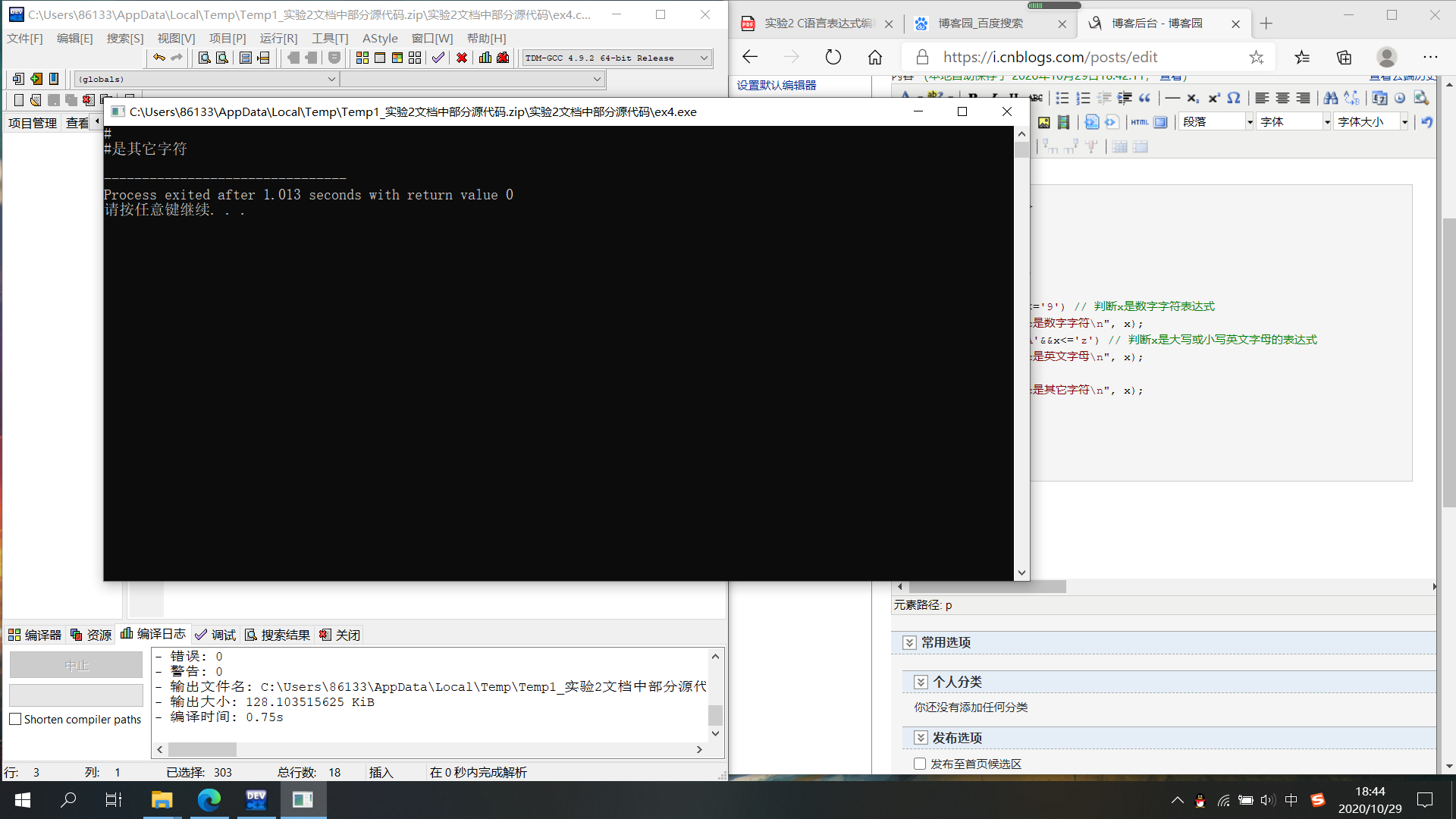 #include <stdio.h> int main() { char x; x = getchar(); if( x>='0'&&x<='9') // 判断x是数字字符表达式 printf("%c是数字字符\n", x); else if( x>='A'&&x<='z') // 判断x是大写或小写英文字母的表达式 printf("%c是英文字母\n", x); else printf("%c是其它字符\n", x); return 0; }