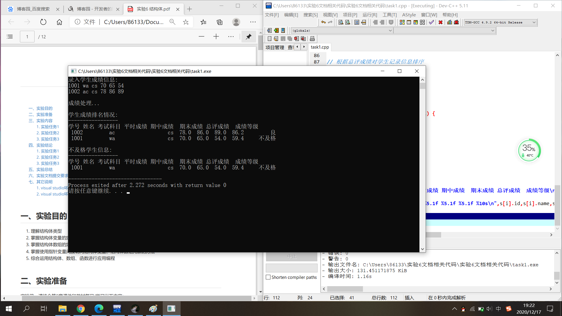#include<stdio.h> #include<stdlib.h> #include<string.h> #define N 2 // 运行程序输入测试时,可以把N改小一些输入测试 typedef struct student { int id; /*学生学号 */ char name[20]; /*学生姓名 */ char subject[20]; /*考试科目 */ float perf; /*平时成绩 */ float mid; /* 期中成绩 */ float final; /* 期末成绩 */ float total; /* 总评成绩 */ char level[10]; /* 成绩等级 */ } STU; void input(STU[],int ); /*输入学生信息 */ void calc(STU[],int); /*计算总评和等级 */ int fail(STU[],STU [],int); /*不及格学生统计 */ void sort(STU[],int); /*排序 */ void print(STU[], int); /*输出学生信息*/ int main() { STU st[N],fst[N]; // 数组st记录学生信息,fst记录不及格学生信息 int k; // 用于记录不及格学生个数 printf("录入学生成绩信息:\n"); input(st,N); printf("\n成绩处理...\n"); calc(st,N); k = fail(st,fst,N); sort(st, N); printf("\n学生成绩排名情况:\n"); print(st, N); printf("\n不及格学生信息:\n"); print(fst, k); return 0; } // 输入学生信息 void input(STU s[],int n) { int i; for(i=0;i<n;i++) scanf("%d %s %s %f %f %f",&s[i].id,s[i].name,s[i].subject,&s[i].perf,&s[i].mid,&s[i].final); } // 计算总评和等级 void calc(STU s[],int n) { int i; for(i=0;i<n;i++) { s[i].total=s[i].perf*0.2+s[i].mid*0.2+s[i].final*0.6; if(s[i].total>=90) strcpy(s[i].level,"优"); // 注意:等级是字符型数组,要使用strcpy完成赋值 else if(s[i].total>=80 && s[i].total<90) strcpy(s[i].level,"良"); else if(s[i].total>=70 && s[i].total<80) strcpy(s[i].level,"中"); else if(s[i].total>=60 && s[i].total<70) strcpy(s[i].level,"及格"); else strcpy(s[i].level,"不及格"); } } // 不及格学生统计 // 数组s存放的是所有学生信息,数组t存放不及格学生信息,n是数组s中元素个数 // 函数返回值:返回的是不及格人数 int fail(STU s[],STU t[],int n) { int i,k=0; for(i=0;i<n;i++) if(s[i].total<60) t[k++]=s[i]; return k; } // 根据总评成绩对学生记录信息排序 // 使用的是冒泡排序算法 void sort(STU s[],int n) { int i,j; STU temp; for(i=0;i<n-1;i++) for(j=0;j<n-1-i;j++) if(s[j].total<s[j+1].total) { temp = s[j]; s[j] = s[j+1]; s[j+1] = temp; } } // 输出学生信息 void print(STU s[], int n) { int i; printf("-----------------\n"); printf("学号 姓名 考试科目 平时成绩 期中成绩 期末成绩 总评成绩 成绩等级\n"); for(i=0;i<n;i++) printf("%5d %10s%20s %5.1f %5.1f %5.1f %5.1f %10s\n",s[i].id,s[i].name,s[i].subject,s[i].perf,s[i].mid,s[i].final,s[i].total,s[i].level); }