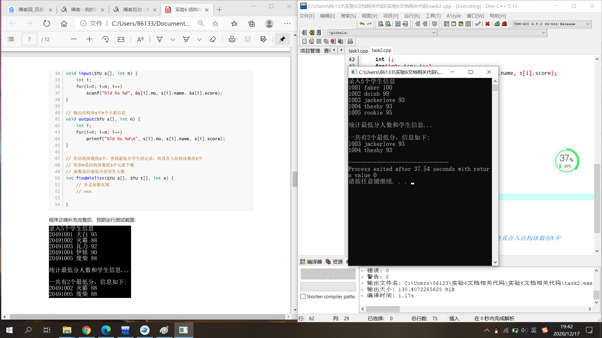 #include <stdio.h> const int N=5; // 定义结构体类型struct student,并定义STU为其别名 typedef struct student { long no; char name[20]; int score; }STU; // 函数声明 void input(STU s[], int n); int findMinlist(STU s[], STU t[], int n); void output(STU s[], int n); int main() { STU stu[N], minlist[N]; int count; printf("录入%d个学生信息\n", N); input(stu, N); printf("\n统计最低分人数和学生信息...\n"); count = findMinlist(stu, minlist, N); printf("\n一共有%d个最低分,信息如下:\n", count); output(minlist, count); return 0; } // 输入n个学生信息,存放在结构体数组s中 void input(STU s[], int n) { int i; for(i=0; i<n; i++) scanf("%ld %s %d", &s[i].no, s[i].name, &s[i].score); } // 输出结构体s中n个元素信息 void output(STU s[], int n) { int i; for(i=0; i<n; i++) printf("%ld %s %d\n", s[i].no, s[i].name, s[i].score); } int findMinlist(STU s[], STU t[], int n) { int j,k=0; STU temp; for(j=0;j<n-1;j++) { if(s[j].score<s[j+1].score) { temp=s[j]; s[j]=s[j+1]; s[j+1]=temp; } } for(j=0;j<n;j++) { if(s[j].score==s[n-1].score) t[k++]=s[j]; } return k; }