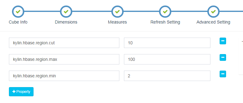 在Cube设计下,通过Configuration Overwrites设置分区,分区数量对应Hbase中的Region数量: