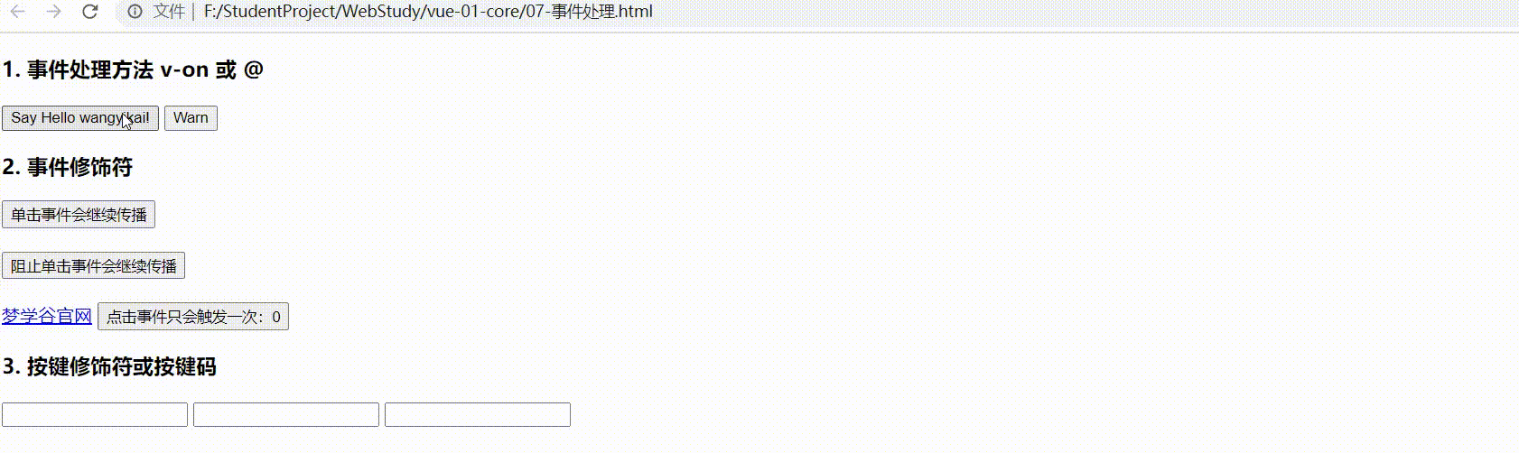 - 当调用的函数,有多个参数传入时,需要使用原生DOM事件,则通过 $event 作为实参传入