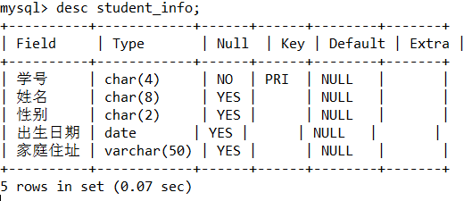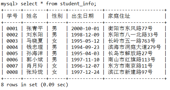 mysql> INSERT INTO student_info(学号,姓名,性别,出生日期,家庭住址)