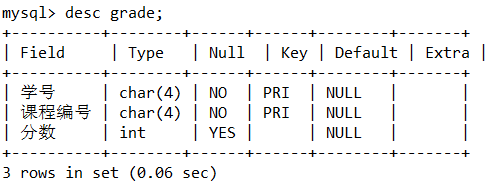 课程编号 char(4) not null, primary key(学号,课程编号),