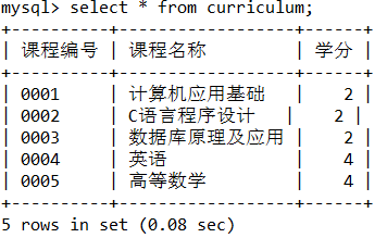mysql> insert into curriculum(课程编号,课程名称,学分)