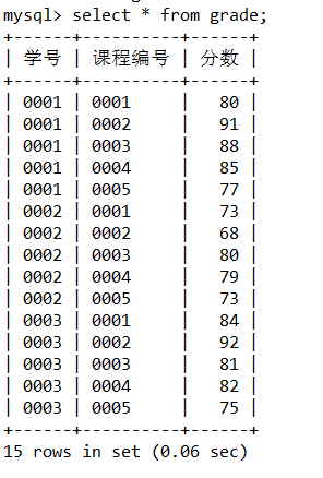 mysql> INSERT INTO grade(学号,课程编号,分数)