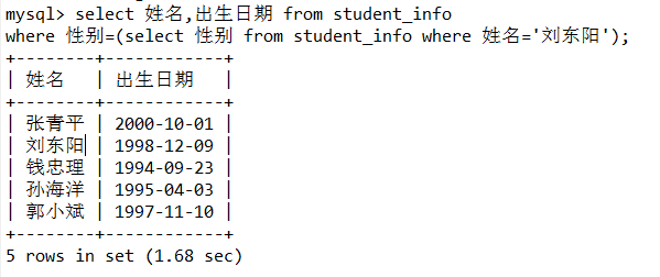 1.在student_info表中查找与“刘东阳”性别相同的所有学生的姓名、出生日期。