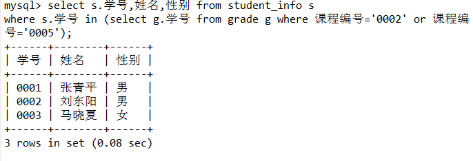 2.使用IN子查询查找所修课程编号为0002、0005的学生学号、姓名、性别。