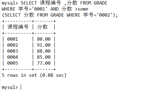 WHERE 学号='0001' AND 分数 >some