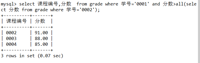 3.使用ANY子查询查找学号为0001的学生的分数比0002号的学生的最低分数高的课程编号和分数。