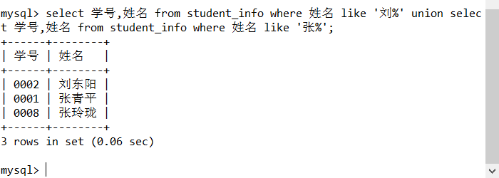 select 学号,姓名 from student_info where 姓名 like '刘%' union select 学号,姓名 from student_info where 姓名 like '张%';