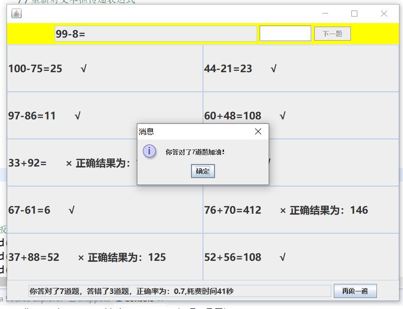 在刚开始的时候觉得做一个0~100的加减运算的程序十分简单,而且老师也对需求分析有所提示,在完成具体设计之前感觉都很顺利,但到具体设计时,发现自己寸步难行,在控制台上输出加减运算十分容易,但是要做一个页面,在页面上让用户计算却十分艰难,发现自己能力非常欠缺;在朋友的帮助下,渐渐有了思路,但代码的编写总是红色的线到处横行,最终在朋友的帮助下得以完成。但程序还不够完美,存在一些缺陷,可以再进行修改提升。