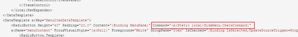 留意Command="{x:Static local:SideMenu.CheckCommand}"这一句
