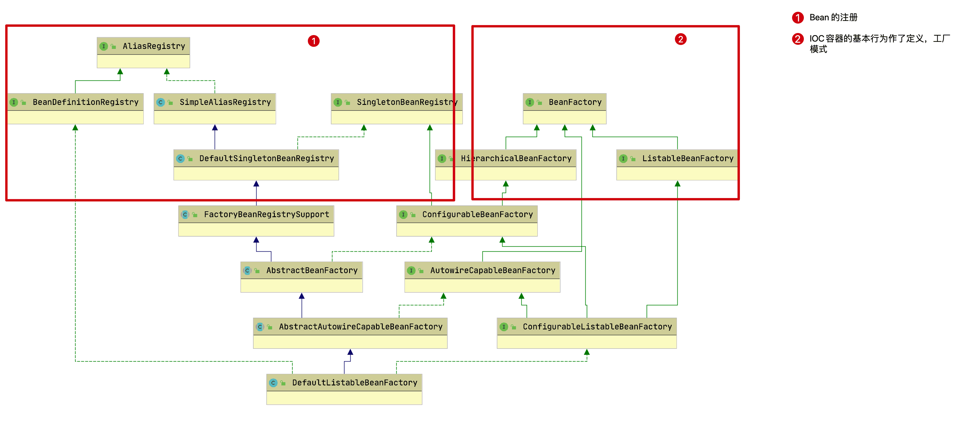 - HierarchicalBeanFactory 和 ListableBeanFactory: ApplicationContext 继承了 HierarchicalBeanFactory 和 ListableBeanFactory 接口,在此基础上,还通过多个其他的接口扩展了 BeanFactory 的功能: