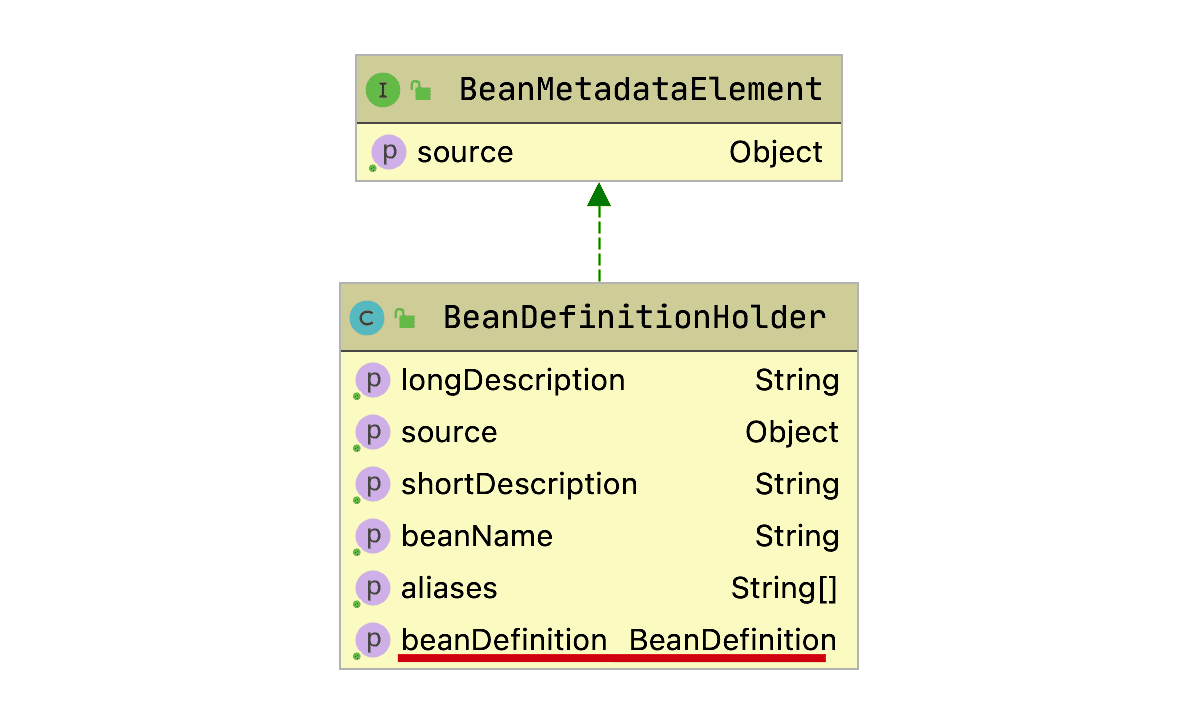 - BeanDefinitionHolder 这是BeanDefination的包装类,用来存储BeanDefinition,name以及aliases等。