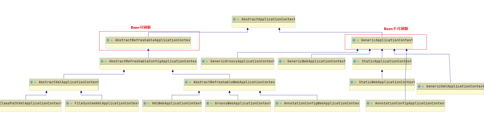 - AbstractRefreshableApplicationContext: AbstractRefreshableApplicationContext及子类的每次refresh都是先清除已有(如果不存在就创建)的容器,然后再重新创建;AbstractRefreshableApplicationContext及子类无法做到GenericApplicationContext混合搭配从不同源头获取bean的定义信息