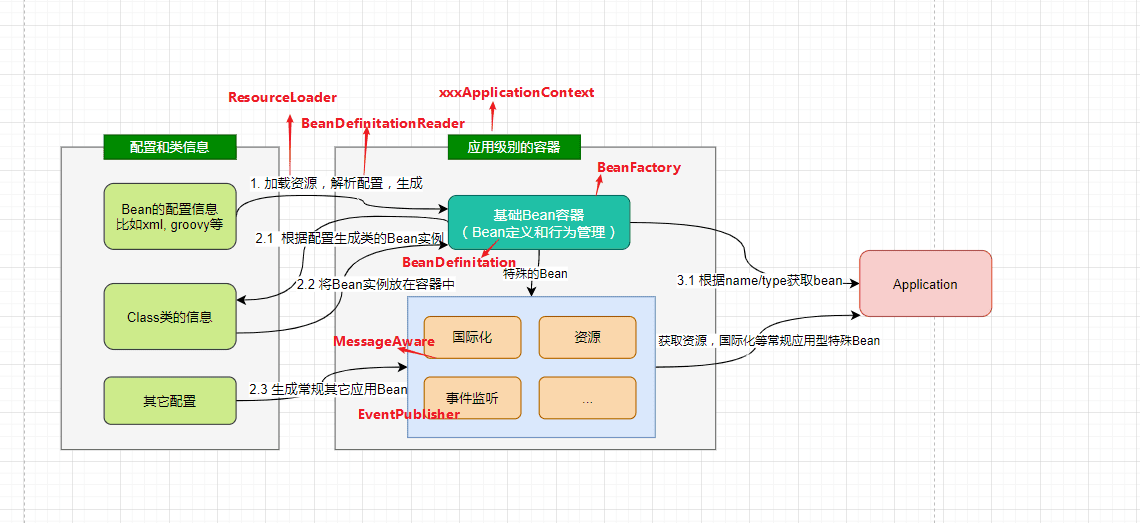 IoC容器的接口类是ApplicationContext,很显然它必然继承BeanFactory对Bean规范(最基本的ioc容器的实现)进行定义。而ApplicationContext表示的是应用的上下文,除了对Bean的管理外,还至少应该包含了