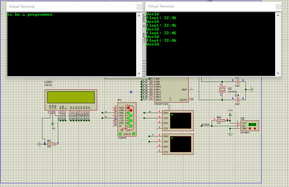 解决:经过多方查找资料,解决不也问题。最后发现有的网上的proteus仿真实例接virtual terminal时只接一根线。受到启发,断开一根线,可以看到实验现象。