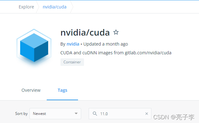 我们做的就是取hub.docker.com这个网站上 找到自己喜欢的docker版本。docker版本其实就是别人写好的一些模板,跟ppt模板一样,我们先下下来然后自己修修改改变成自己的模板。模板有各个方向的 ,我们深度学习肯定要挑关于cuda的。点explore 搜nvidia 进入nvidia/cuda 在tag搜索自己的cuda版本 我用的是11.0-cudnn8 - runtime - ubu16.04 下图只是示例