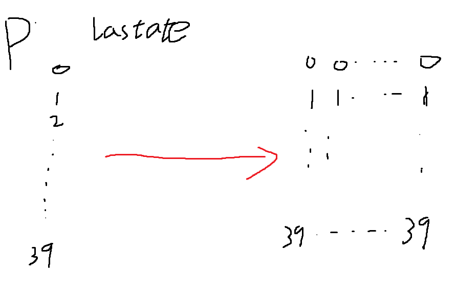 laststate 就是前面一天 表现为yi的概率 。 长度是39 代表了每一类。但是这里有 reshape(39,1) 就表示变成了39行。 transtabnle是一个39乘以39的矩阵。这两个矩阵相加,就要对latestate进行行扩充。 下面的0 就表示 预测值为0的概率。