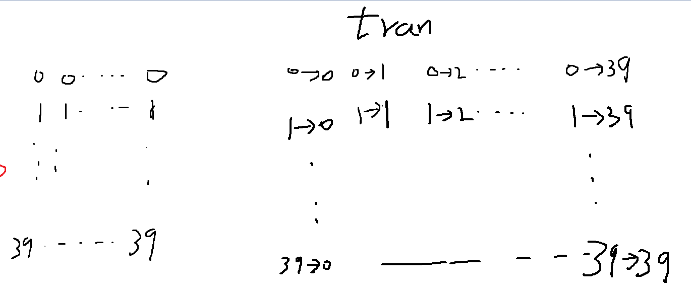再看 下面两个的相加 我们知道 其实就是相乘 tran的每个位置i,j都是i到j的概率。那么 相加之后的矩阵意思就是 如果上一天是yi 今天表现为yj的概率。