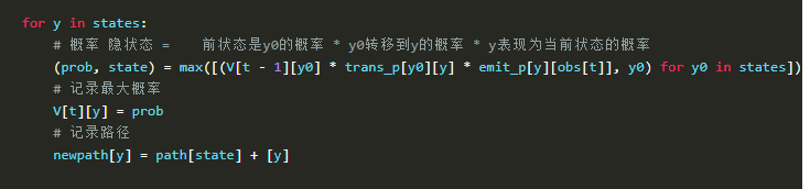这一句相当于上面例子里的这一段。前一个是y0的概率然后乘以从y0转到yi的概率 再乘以现在这个表现为yi的概率。 我们就得到了在前一个表现为y0的情况下,这个表现为yi的概率。 我们会得到39个。我们来细看 这一句到底是怎么算的。