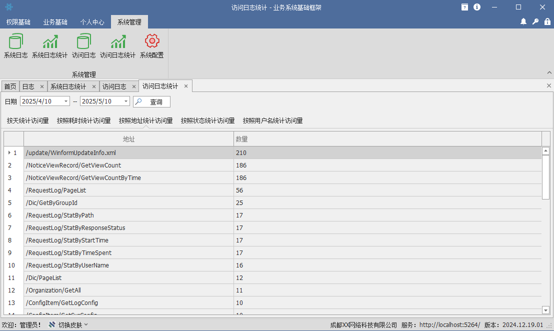 按天统计访问量,按照耗时统计访问量,按照地址计访问量,按照状态统计访问量,按照用户名统计访问量
