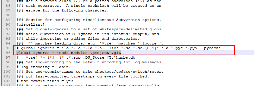 3.复制# global-ignores =在下一行中去掉‘#’写下global-ignores = *node_modules .project .git,如图2