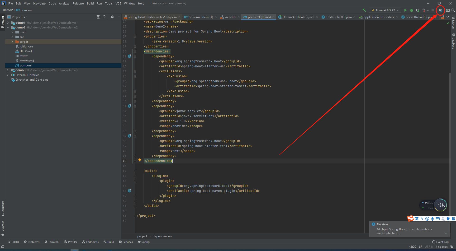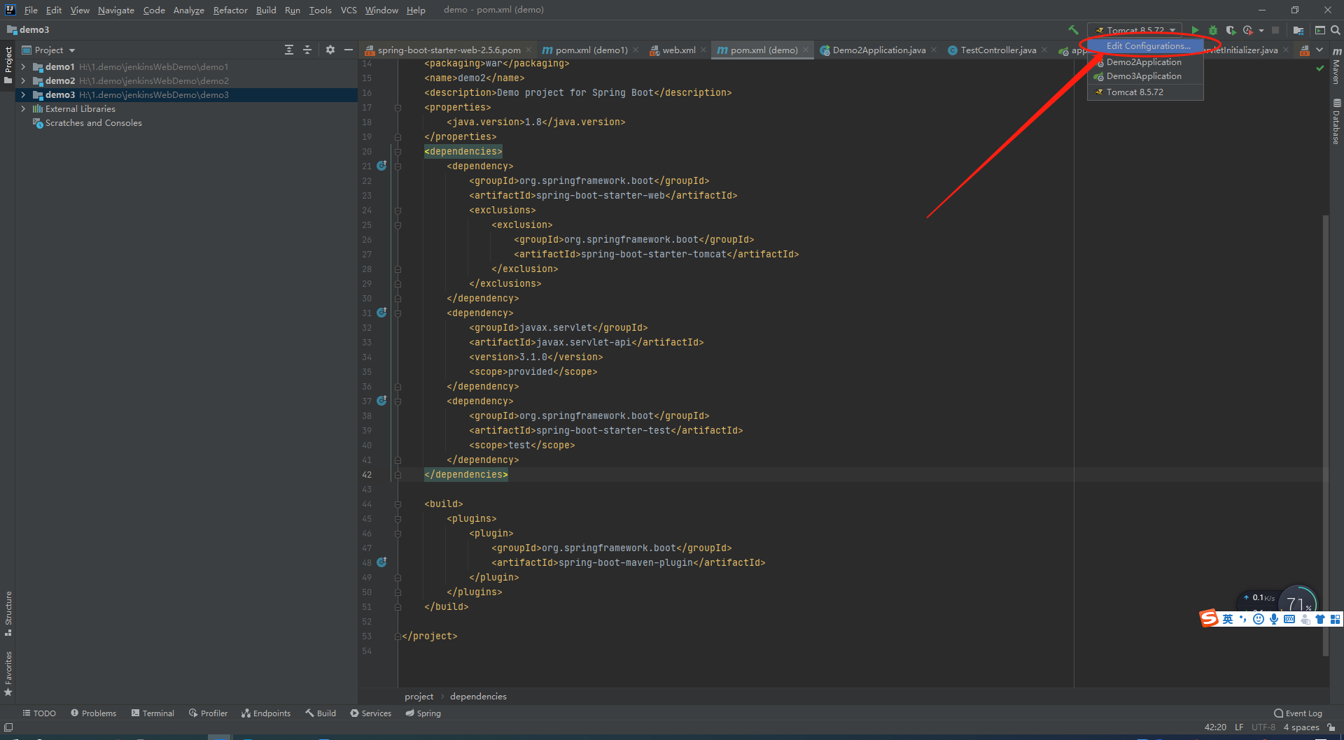 15。修改pom文件,不需要内嵌式的tomcat了,需要selvet-api,否则打包会失败。