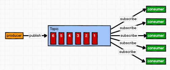 Kafka是发布订阅模式。消息生产者(发布)将消息发布到topic中,同时有多个消息消费者(订阅)消费该消息。和点对点方式不同,发布到topic的消息会被所有订阅者消费。