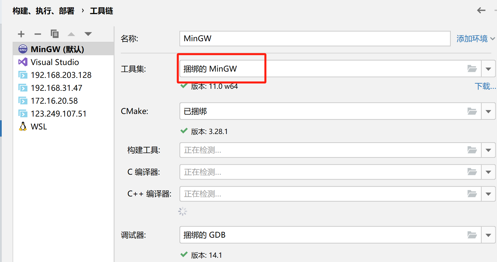 使用安装的minGW路径,工具链使用配置的minGW其他不变