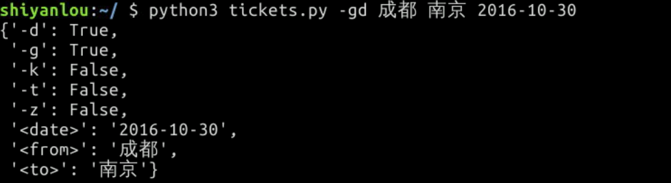 上面的程序中, docopt 会根据我们在 docstring 中的定义的格式自动解析出参数并返回一个字典,也就是 arguments, 我们打印出了这个字典的内容。下面我们运行一下这个程序, 比如查询一下10月30号从成都到南京的动车和高铁: