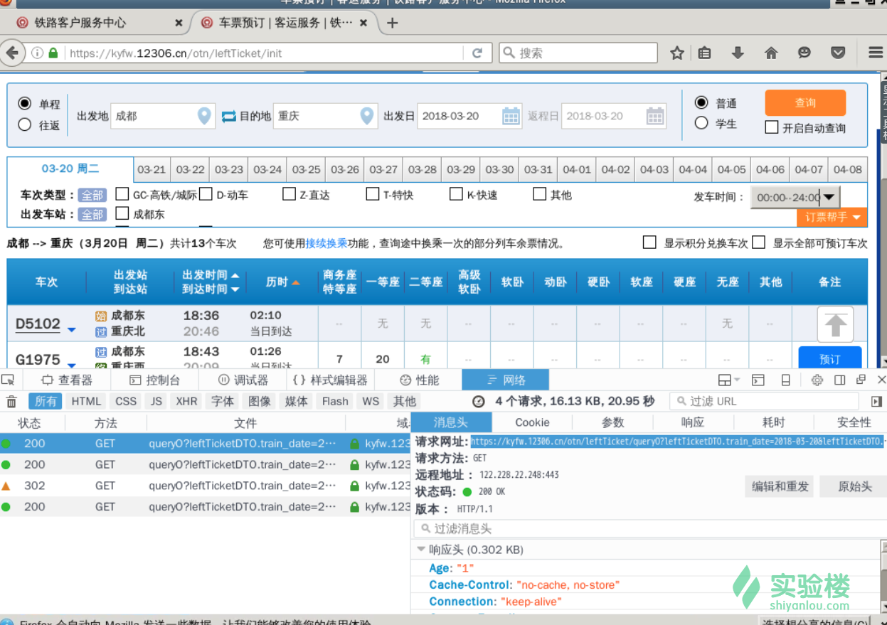 参数已经解析好了,下面就是如何获取数据了,这也是最主要的部分。首先我们用实验楼环境的Firefox浏览打开 12306,进入余票查询页面,按下 F12 打开开发者工具,选中 Network 一栏,在查询框中随便查询一次,我们在调试工具观察下请求和响应: