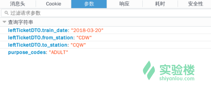 注意到上面的请求 URL ,它是由基 URL https://kyfw.12306.cn/otn/leftTicket/queryO 加四个参数构成的,这四个参数分别代表,查询的类型(成人?学生?),日期,出发车站,到达车站: