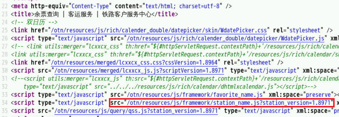 接下来问题就简单了,我们只需要利用这个接口, 构建请求URL然后解析返回的JSON数据就可以了。但是我们发现,URL里面参数 from_station 和 to_station 并不是汉字,而是一个代号,而我们想要输入的是汉字,我们要如何获取代号呢?我们打开网页源码看看有没有什么发现。