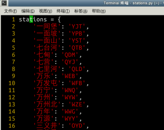 我们运行这个脚本,它将以字典的形式返回所有车站和它的大写字母代号, 我们将结果重定向到 stations.py 中,