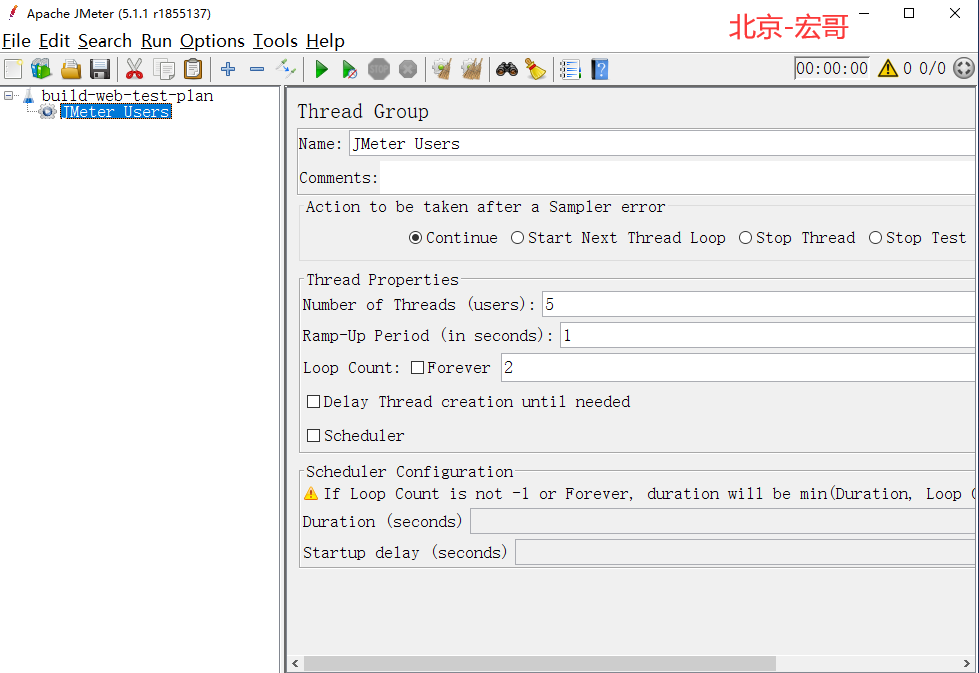 您要对每个JMeter测试计划进行的第一步是添加一个 线程组元素。线程组告诉JMeter您要模拟的用户数量,用户应多久发送一次请求以及应发送多少次请求。