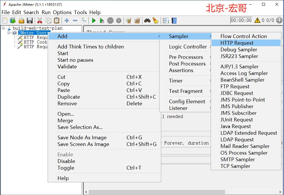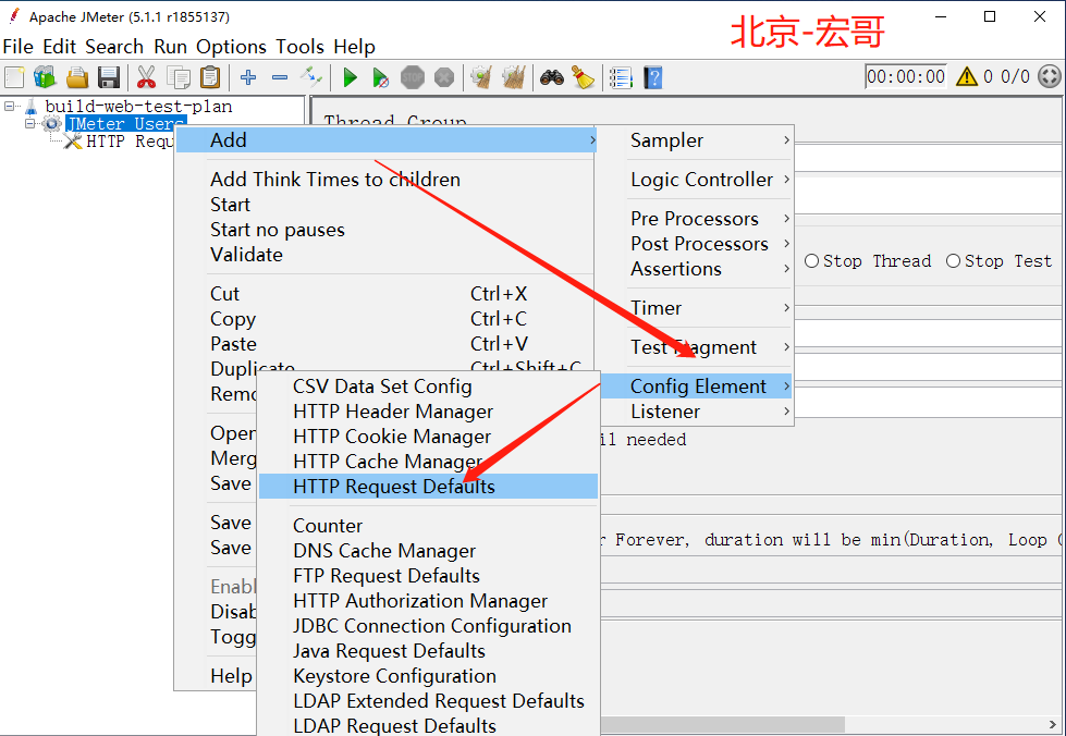 继续并通过首先选择“测试计划”来添加ThreadGroup元素,单击鼠标右键以获得“添加”菜单,然后选择“添加”→“线程组”。