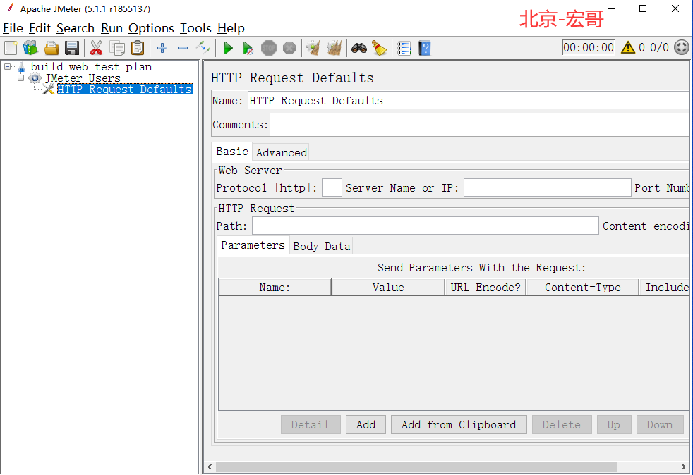 现在我们已经定义了用户,是时候定义他们将要执行的任务了。在本部分中,您将为HTTP请求指定默认设置。然后,在第1.3节中,您将添加使用您在此处指定的某些默认设置的HTTP请求元素。