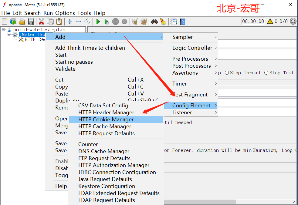 要添加HTTP Cookie管理器,只需选择“线程组”,然后从“编辑”菜单或右键单击弹出菜单中选择“添加”→“配置元素”→“ HTTP Cookie管理器”。