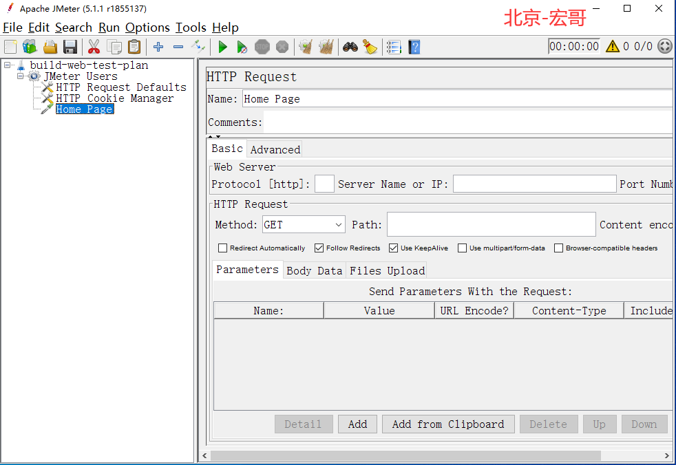 首先将第一个HTTP请求添加 到JMeter Users元素(添加→采样器→HTTP请求)。然后,在树中选择HTTP Request元素并编辑以下属性(请参见图1.6):