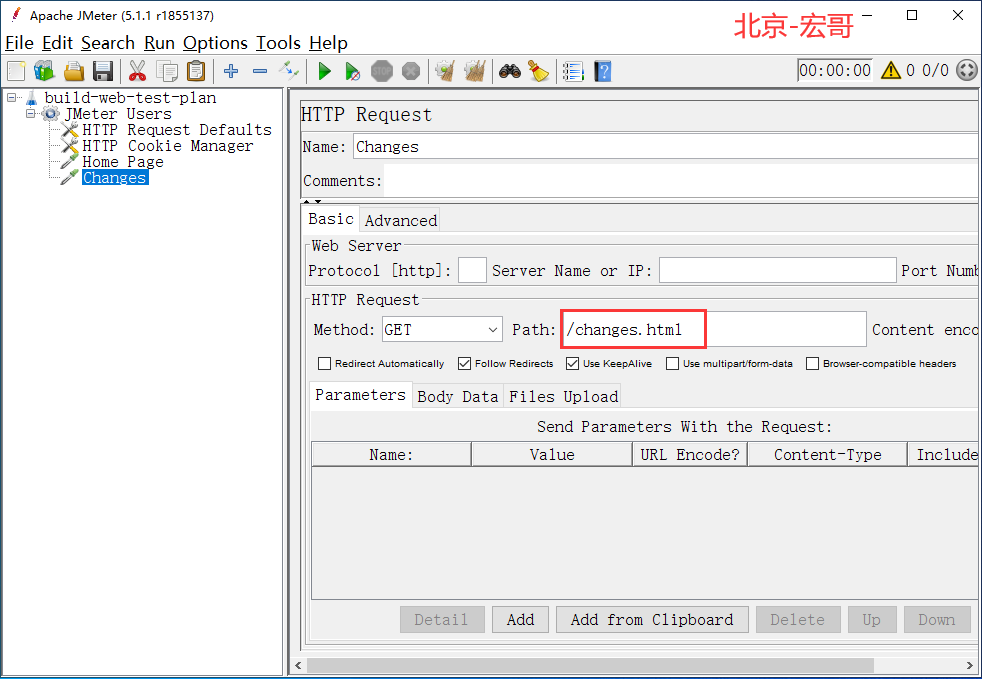 在我们的测试计划中,我们需要发出两个HTTP请求。第一个用于JMeter主页(http://jmeter.apache.org/),第二个用于Change页面(http://jmeter.apache.org/changes.html)。