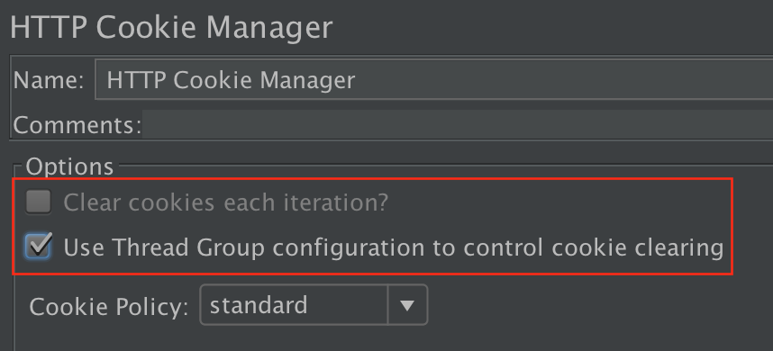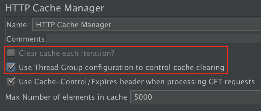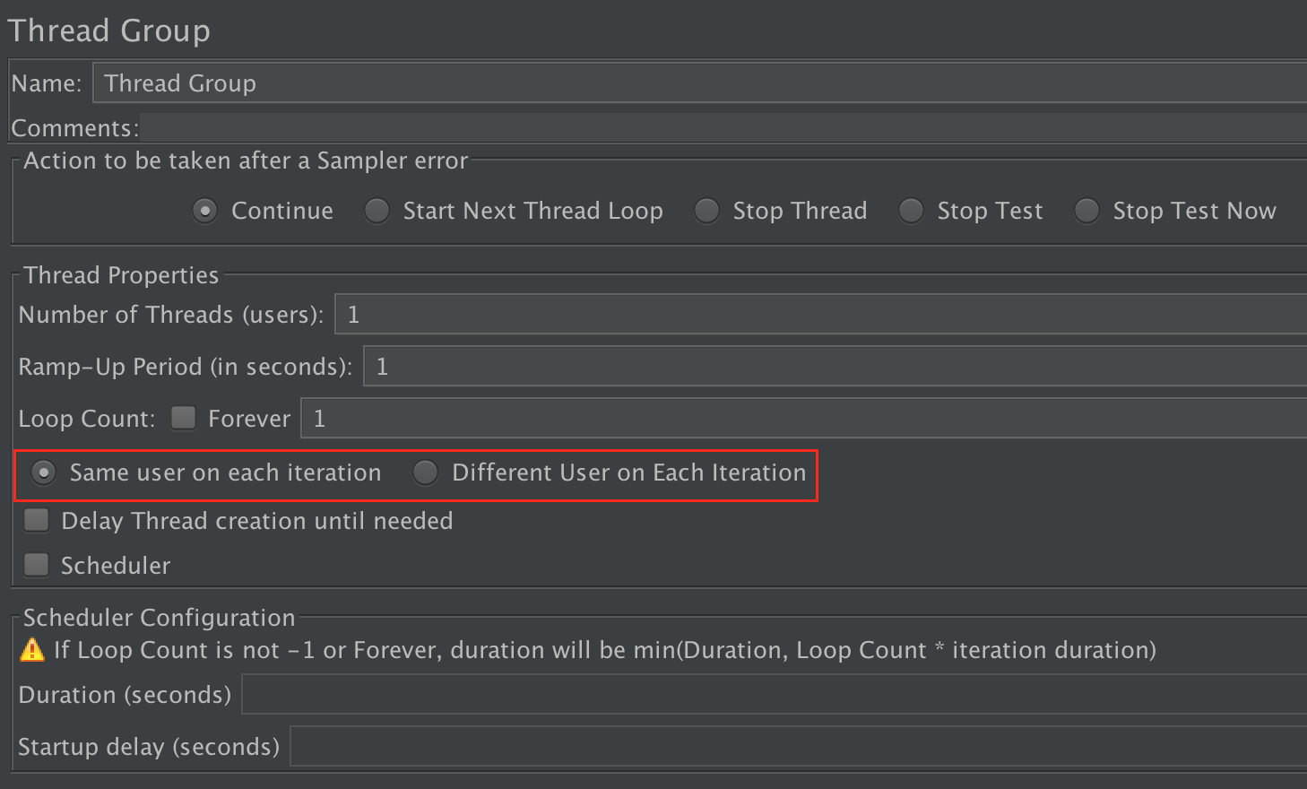 创建测试计划时,在每个线程组迭代中,我们可以选择模拟运行多个迭代的同一用户,或模拟运行一个迭代的不同用户。您可以在线程组元素上配置此行为,并使HTTP缓存管理器,HTTP Cookie管理器,HTTP授权管理器受此设置控制。