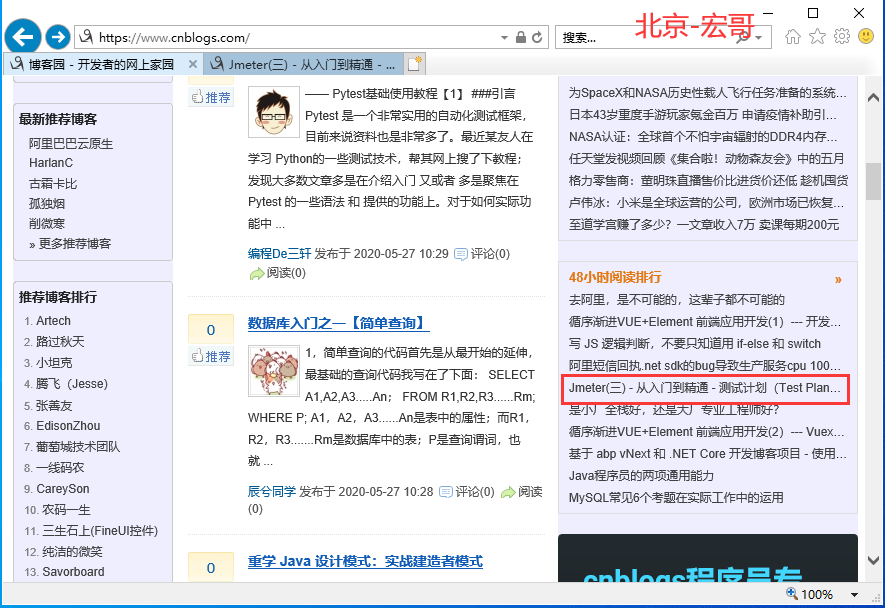 1、浏览器上输入博客园地址,点击文章::Jmeter(三) - 从入门到精通 - 测试计划(Test Plan)的元件(详解教程),如下图所示: