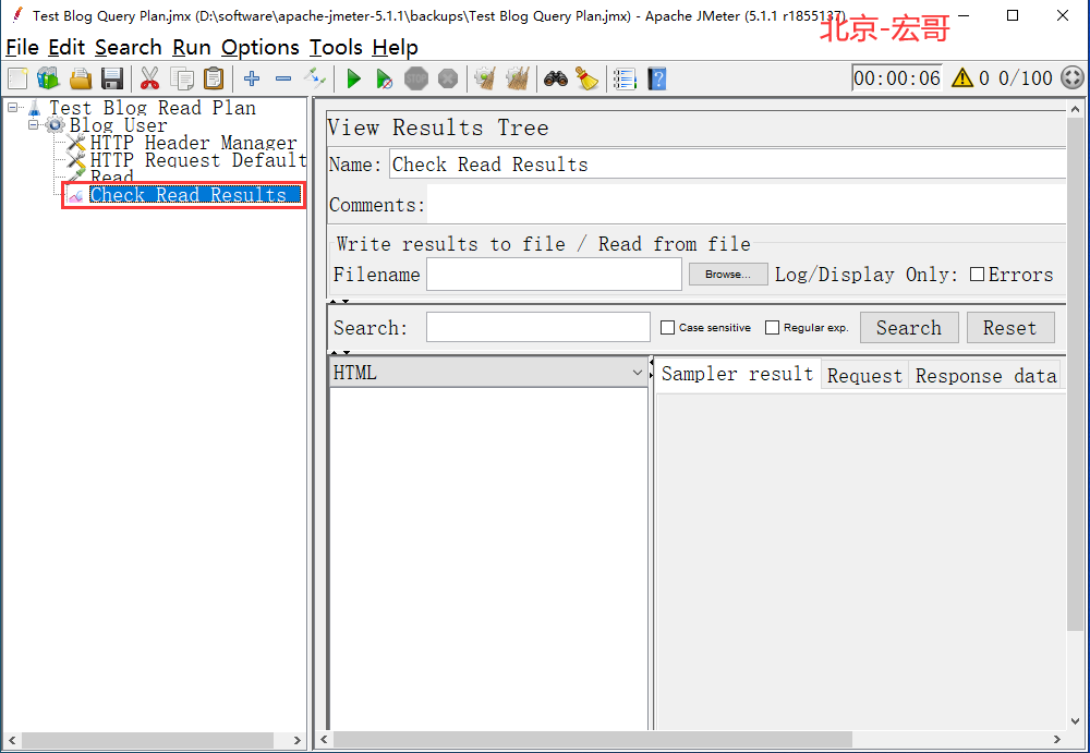6.选中线程组,添加一个结果树,命名为:Check Read Results,监听阅读博文是否成功。如下图所示:
